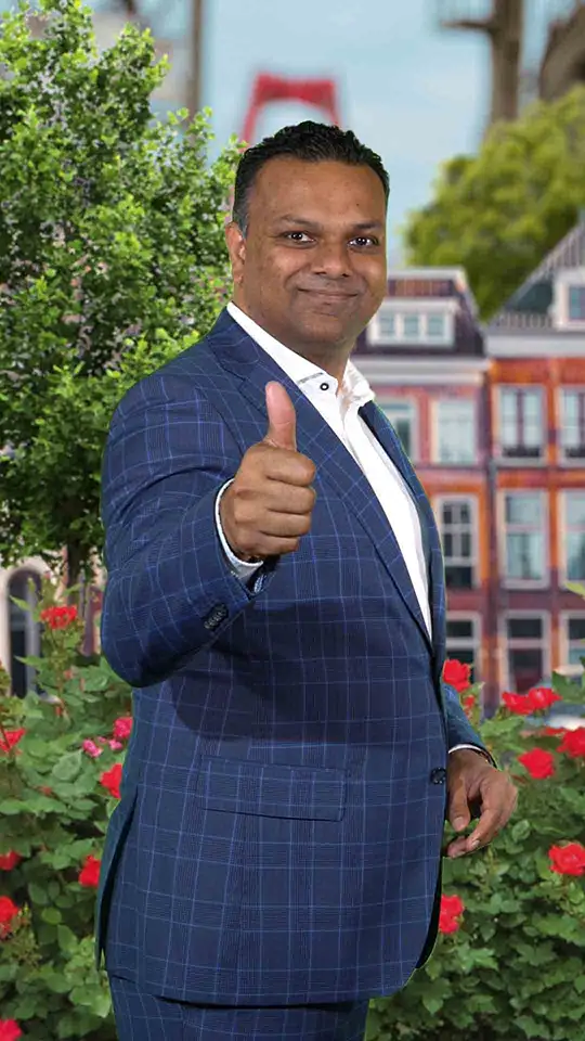 Hoe doen we dat? Om de achtergrond vrij te hebben vervangen we het stuk wat niet zichtbaar is (in dit geval alles achter Richard Moti) met nieuw beeldmateriaal. Een ritje op de fiets later hadden we een foto van de Willemsbrug en konden we deze gebruiken als nieuwe achtergrond. Hierna zetten we de video opname van Richard Moti in beeld, wat woningen erbij en voor je het weet heb je een toffe campagne poster.